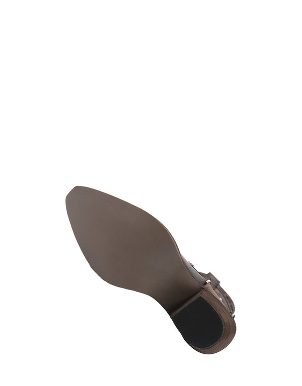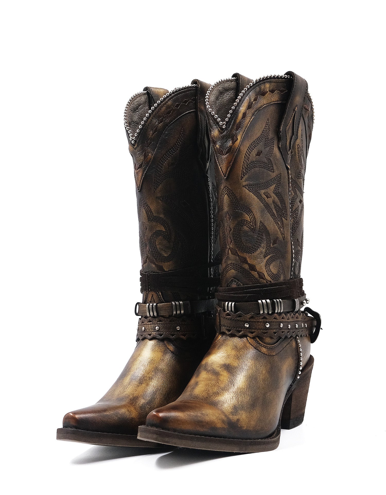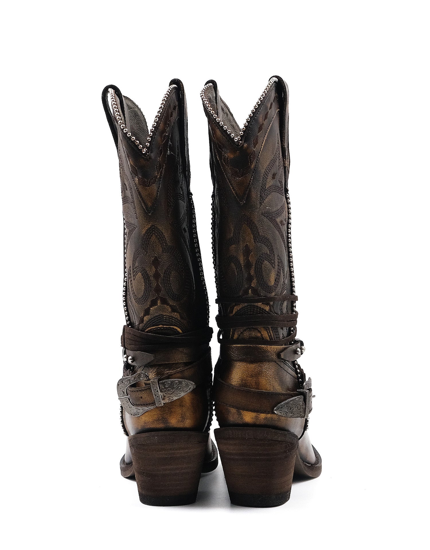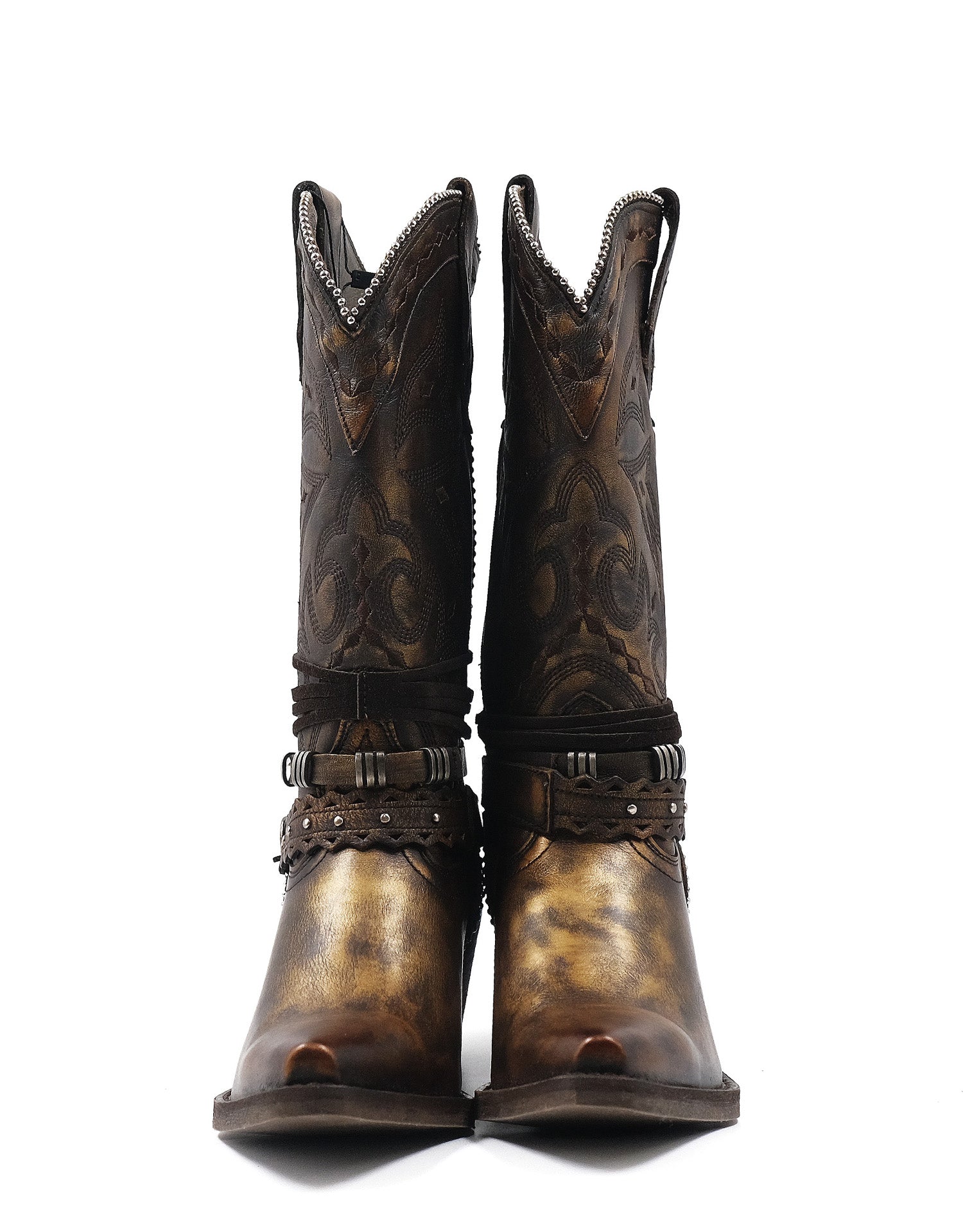 Bota western de piel genuina cobre. Detalles de cadenas y tachas. Estilo con elegancia y carácter.