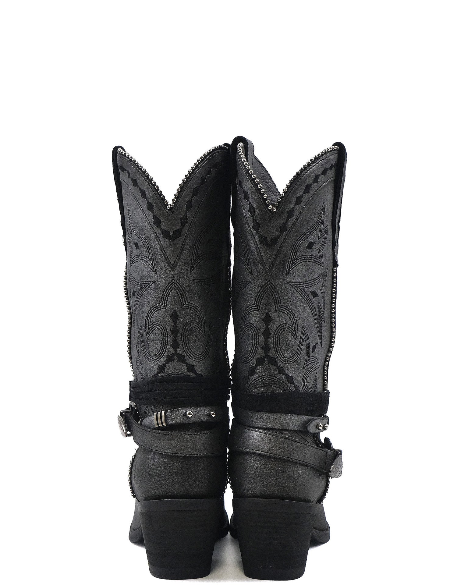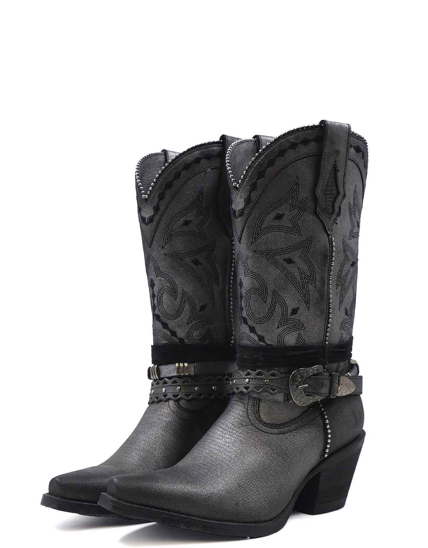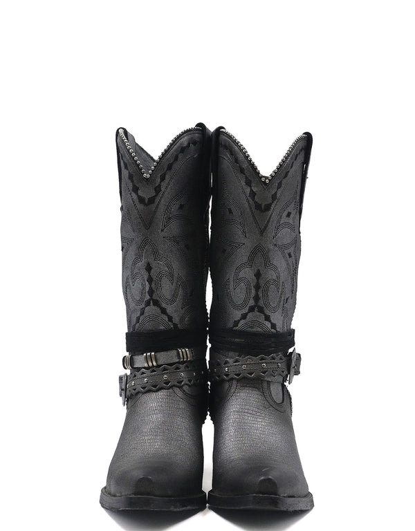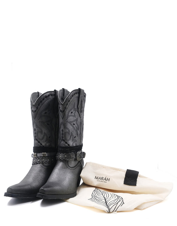 Bota western de piel genuina aluminio. Caña media, punta redonda y tacón bajo. Estilo western con elegancia y confort.