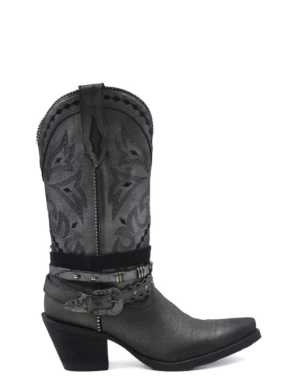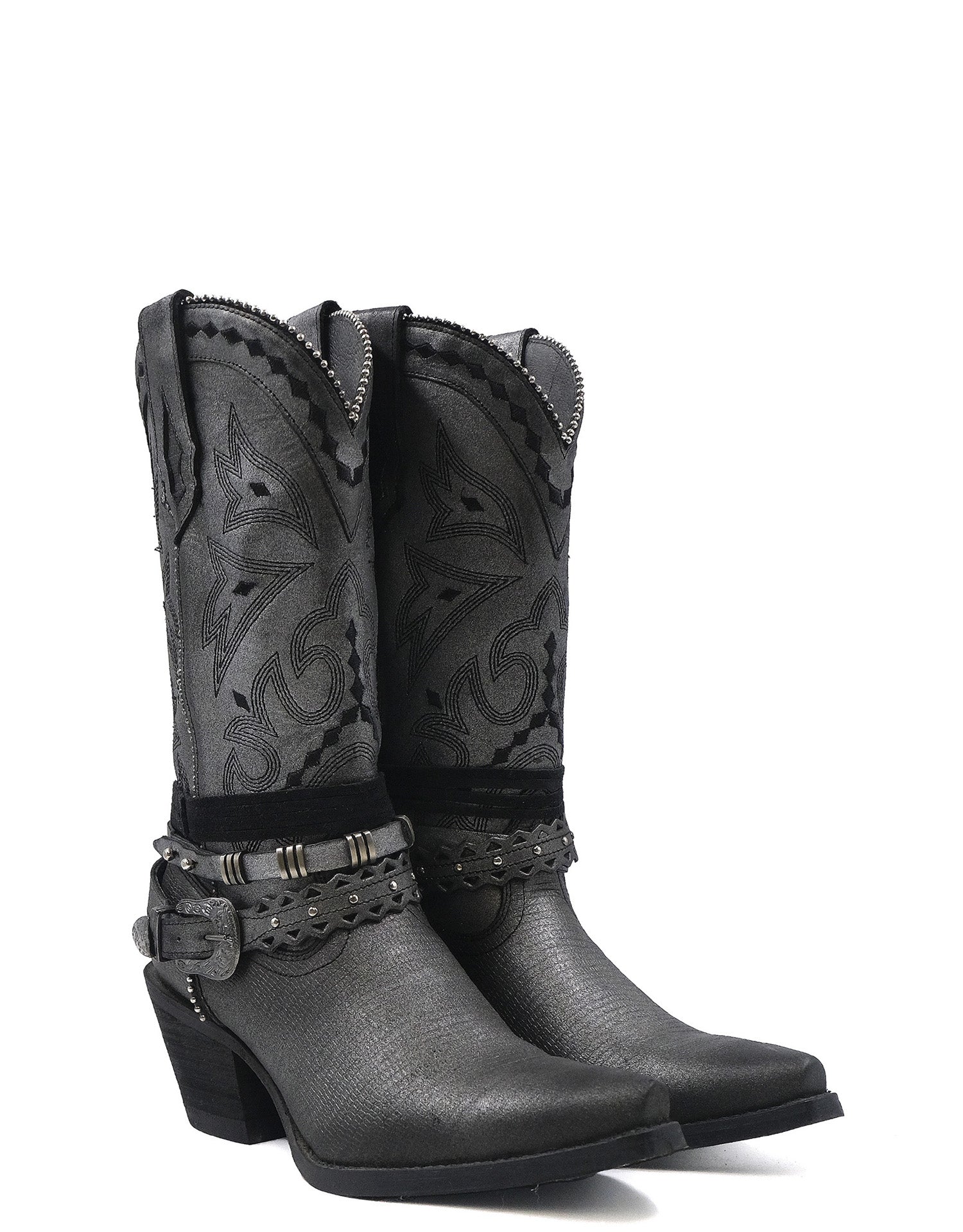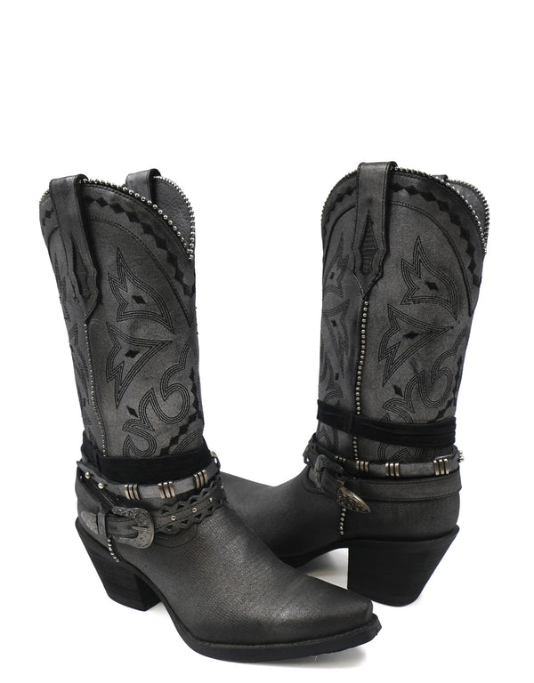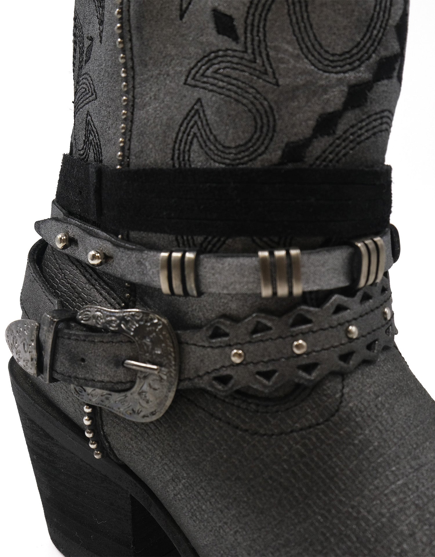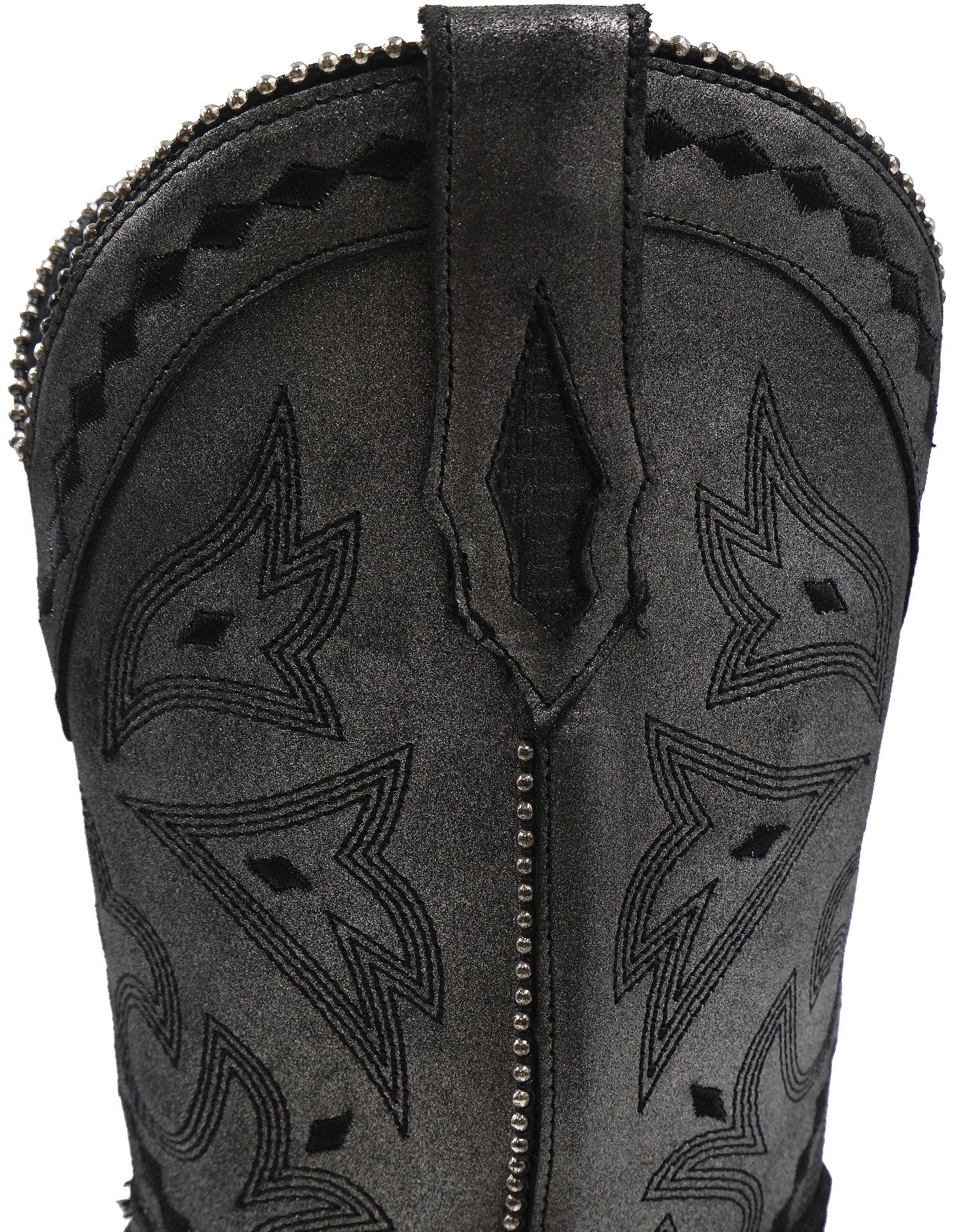 Bota western de piel genuina aluminio. Caña media, punta redonda y tacón bajo. Estilo western con elegancia y confort.