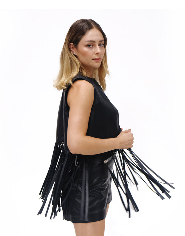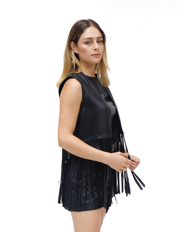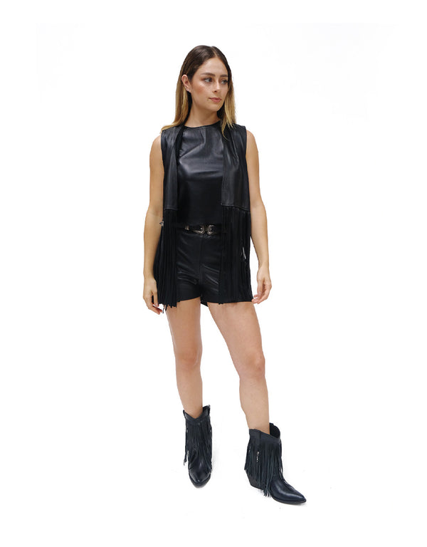 Chaleco de cuero negro para mujer. Confeccionado artesanalmente en piel 100% genuina. Diseño inspirado en México, versátil y elegante.