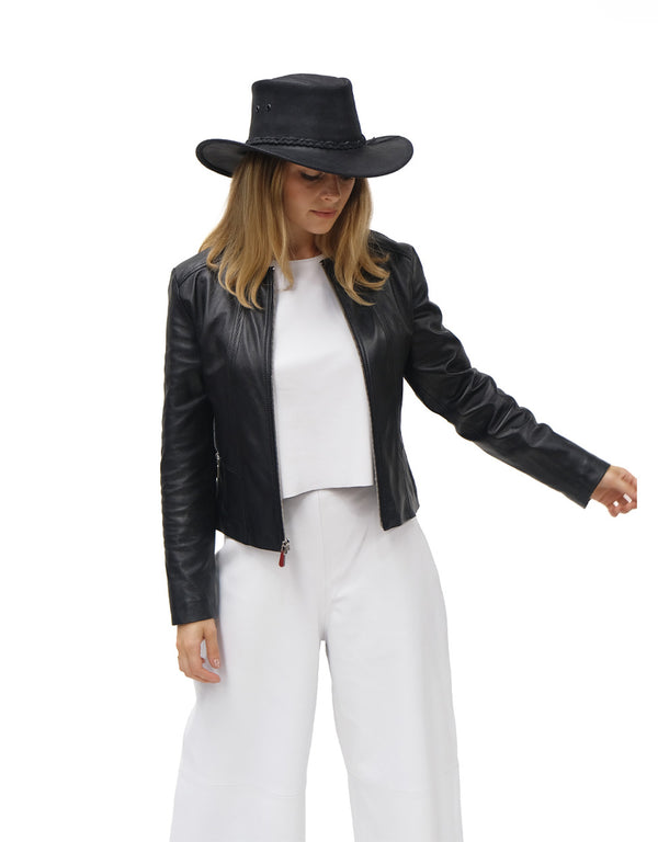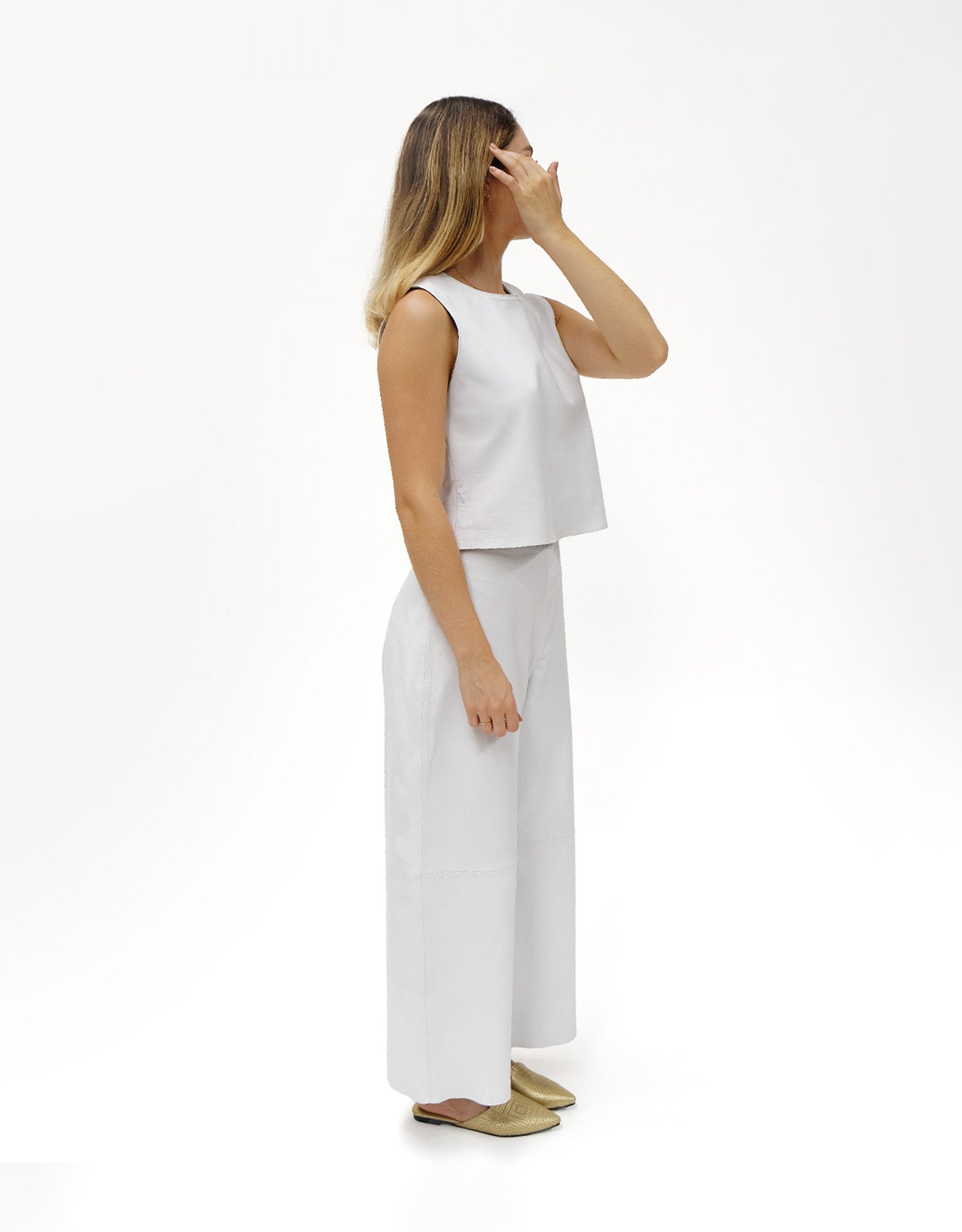 Pantalón de cuero blanco para mujer. Hecho a mano con piel genuina. Diseño artesanal mexicano, sofisticado y atemporal.